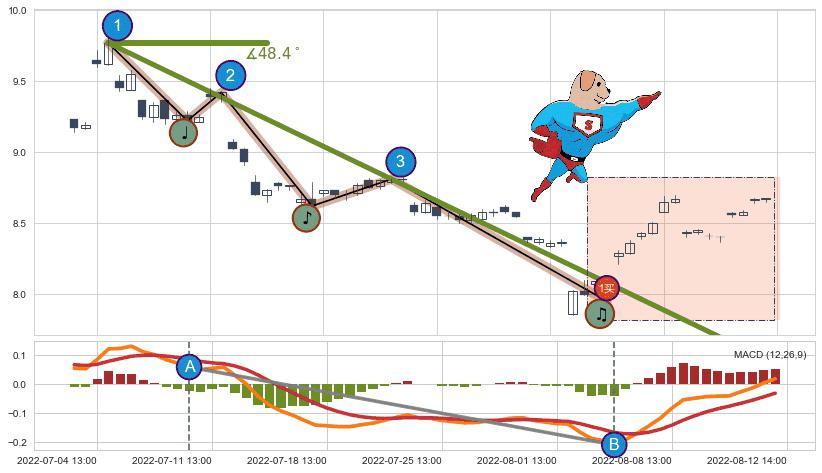 从2022-07-04 14:00至2022-08-05 13:00,共包含48个小时,阶段股价下跌-14.19%,阶段股价变动位移路程比: 1 : 3,下跌趋势角度: 48.4,2022-08-02 13:00向↘︎形成缺口,跳空下跌-4.18%˚