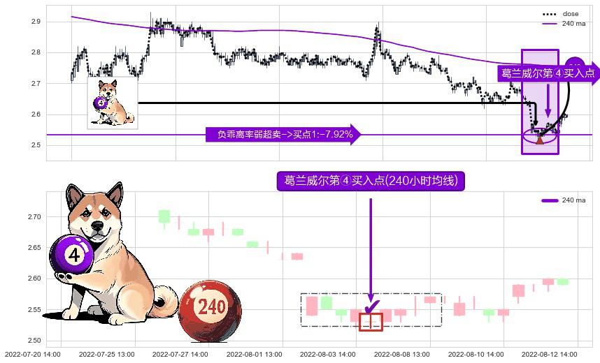 形态多维评估: ⚀ 2022-08-04 13:00:00-小时显现 葛兰威尔均线 240小时均线 第④买入点 下降趋势均值回复的短线反弹信号,后市看涨,买进信号