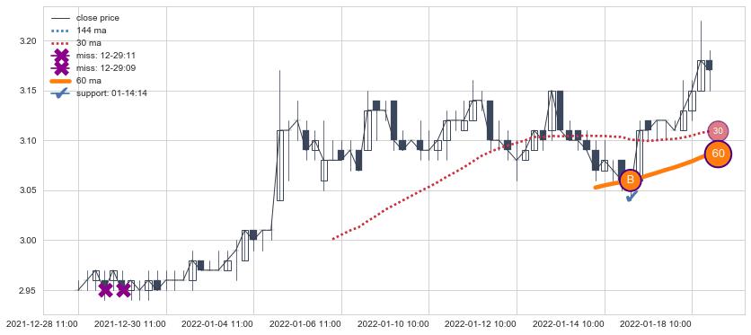下跌趋势04-12 14:00-05-05 11:00,均线144, 60, 30确认关键阻力2处