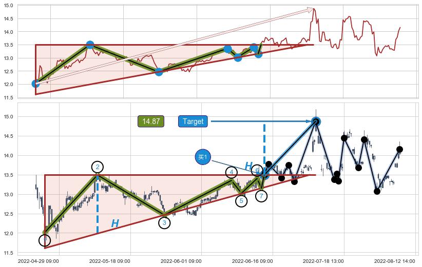 ➢ 最小中继整理涨幅→𝐇: 1.4800 (𝐇楔型旗杆的长度:楔型起点→顶点)