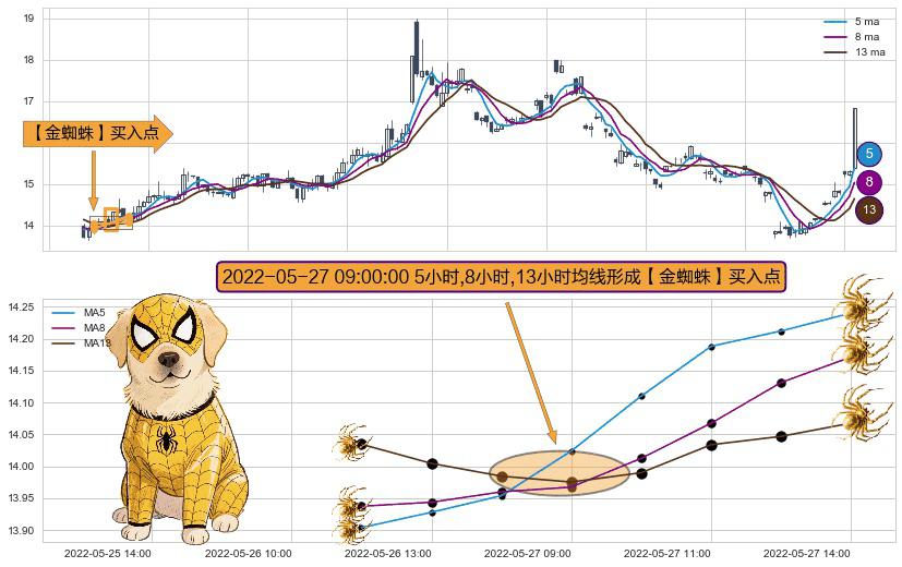 形态多维评估: ⚀ 2022-05-27 09:00:00小时显现 5小时-8小时-13小时均线 【金蜘蛛】买入点 看多信号,后市看涨,买入