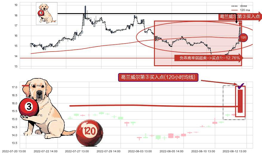 形态多维评估: ⚀ 2022-08-12 13:00:00-小时显现 葛兰威尔均线 120小时均线 第③买入点 上升趋势的中继信号,后市看涨,买进信号