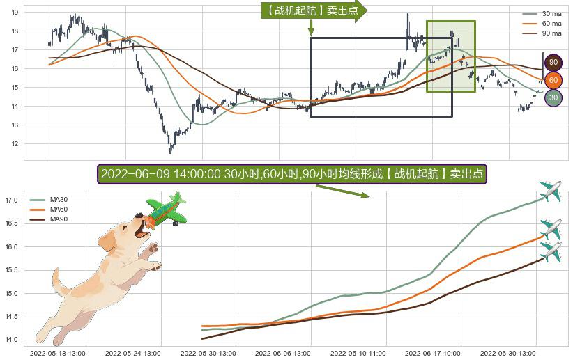 形态多维评估: ⚀ 2022-05-26 14:00:00小时-2022-07-01 13:00:00小时显现 30小时-60小时-90小时均线 【战机起航】卖出点 看空信号,后市看跌,卖出