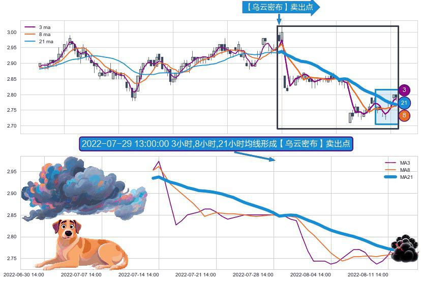 ⚀ 2022-07-14 13:00:00小时-2022-08-12 14:00:00小时显现 3小时-8小时-21小时均线 【乌云密布】卖出点 看空信号,后市看跌,卖出