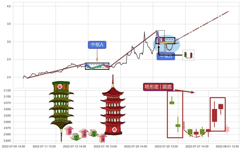 从2022-04-27 09:00至2022-08-03 14:00,共包含228个小时,阶段股价上涨38.45%,阶段股价变动位移路程比: 1 : 7,上涨趋势角度: 21.2,2022-07-07 13:00向⇪形成缺口,跳空上涨+10.07%