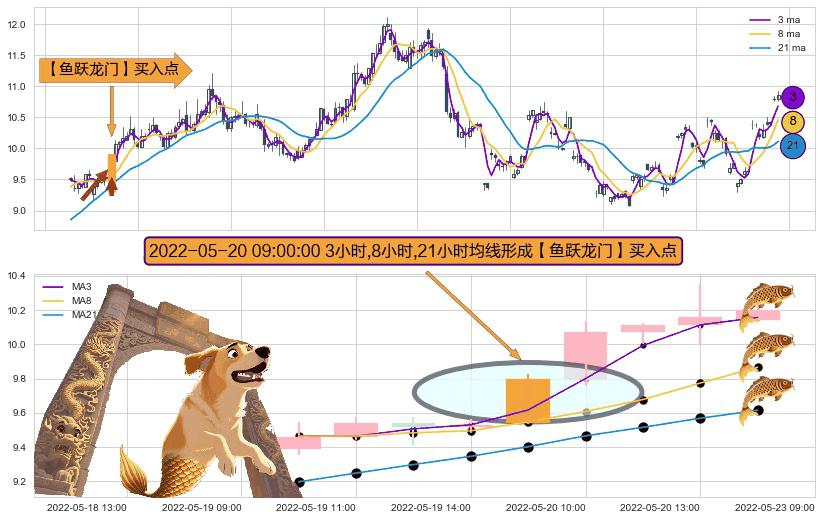 形态多维评估: ⚀ 2022-05-20 09:00:00小时显现 3小时-8小时-21小时均线 【鱼跃龙门】买入点 看多信号,后市看涨,买入