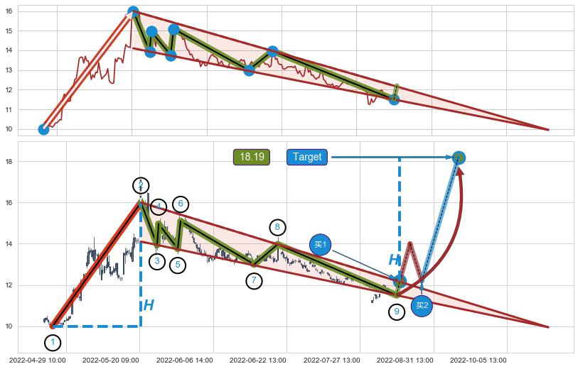 ➢ 最小中继整理涨幅→𝐇: 5.99 (𝐇楔型旗杆的长度:楔型起点→顶点)