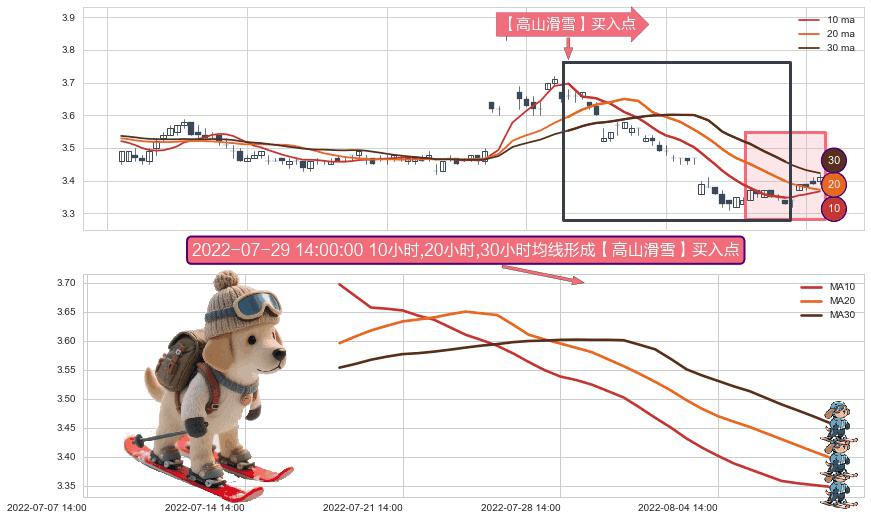 ⚀ 2022-07-19 14:00:00小时-2022-08-10 13:00:00小时显现 10小时-20小时-30小时均线 【高山滑雪】买入点 看多信号,后市看涨,买入