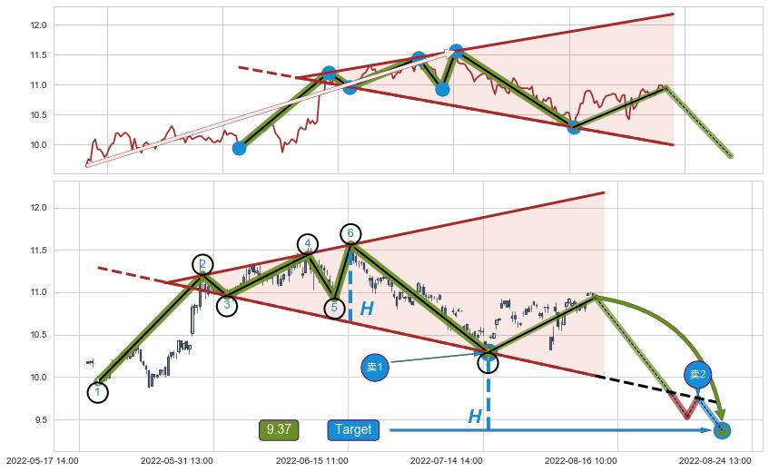 ➢ 最小反转跌幅→𝐇: 0.9177 (逐步抬高阻力斜边最后的阻力点⑥与支撑边垂直距离)