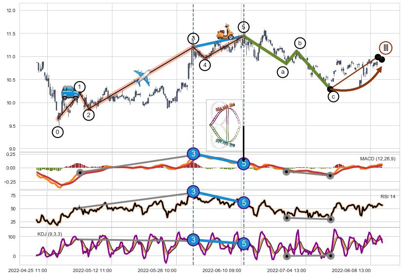 ➢ 1,3,5驱动浪MACD, RSI, KDJ走势都出现【常规背离】反转信号增强