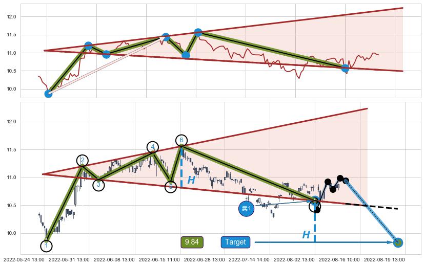| 10 🅚:顶部尽头线(下山虎) ➕ 📐:扩散三角反转下行突破支撑位破位, 猜想持续下沉下跌,被突破的支撑位已变为阻力位 ☞ 看空信号 ⇥ 【🅚线】交织【图形】⇥ 综合量化分数: 47 | > |