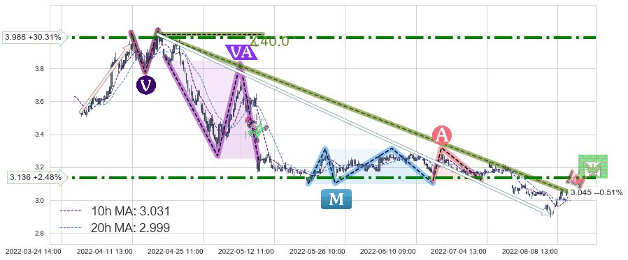 ♘ 阻力价格位3.136,可信任强度80.34%,距离最后交易2022-08-12 14:00形成的收盘价格3.060相差 +2.48%