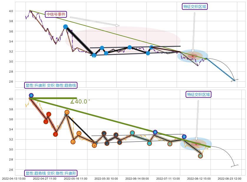 从2022-04-15 09:00至2022-08-11 14:00,共包含291个小时,阶段股价下跌-26.08%,阶段股价变动位移路程比: 1 : 6,下跌趋势角度: 40.0,2022-05-10 09:00向↘︎形成缺口,跳空下跌-11.63%˚
