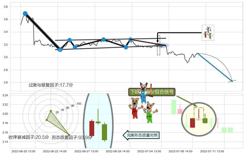 | 5 🅚:【断头铡刀】卖出点 ➕ 📐:升旗形下行突破支撑位破位, 猜想持续下沉下跌,被突破的支撑位已变为阻力位 ☞ 看空信号 ⇥ 【均线】交织【图形】⇥ 综合量化分数: 31 | > |