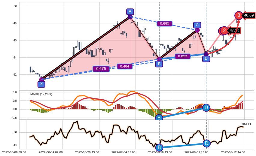➢ 谐波价格D点比B点低 ⤵,【MACD】指标D点比B点高 ⤴️