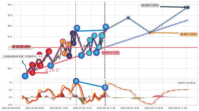 ♘ 支撑价格位44.70,可信任强度92.63%,距离最后交易2022-08-12 14:00形成的收盘价格48.95相差 -8.68%