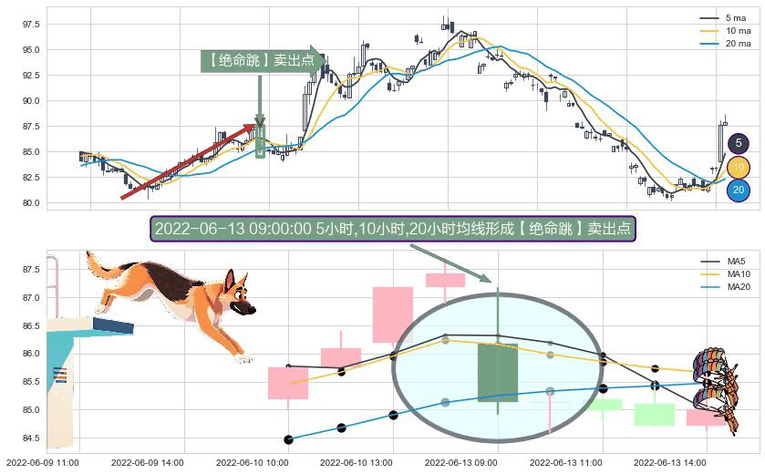 ⚀ 2022-06-13 09:00:00小时显现 5小时-10小时-20小时均线 【绝命跳】卖出点 看空信号,后市看跌,卖出