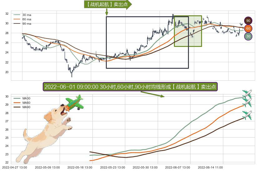 ⚀ 2022-05-16 10:00:00小时-2022-06-17 13:00:00小时显现 30小时-60小时-90小时均线 【战机起航】卖出点 看空信号,后市看跌,卖出