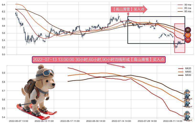 形态多维评估: ⚀ 2022-06-15 13:00:00小时-2022-08-12 14:00:00小时显现 30小时-60小时-90小时均线 【高山滑雪】买入点 看多信号,后市看涨,买入