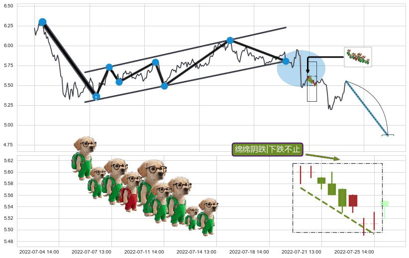 从2022-04-08 14:00至2022-08-12 14:00,共包含314个小时,阶段股价下跌-23.36%,阶段股价变动位移路程比: 1 : 9,下跌趋势角度: 34.7,2022-07-15 13:00向↘︎形成缺口,跳空下跌-6.64%˚