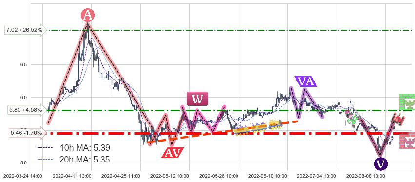 ♘ 阻力价格位5.80,可信任强度66.40%,距离最后交易2022-08-12 14:00形成的收盘价格5.55相差 +4.58%