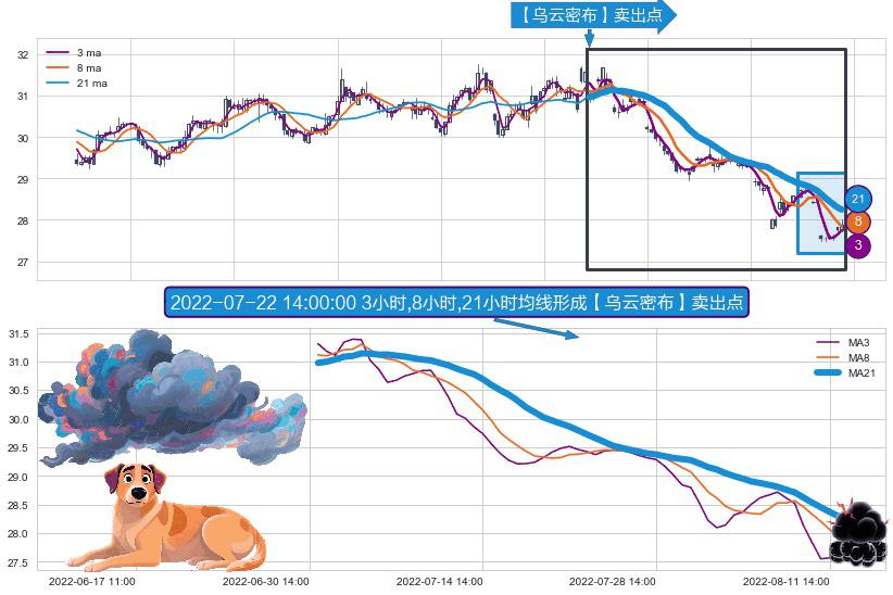 ⚀ 2022-07-01 13:00:00小时-2022-08-12 14:00:00小时显现 3小时-8小时-21小时均线 【乌云密布】卖出点 看空信号,后市看跌,卖出