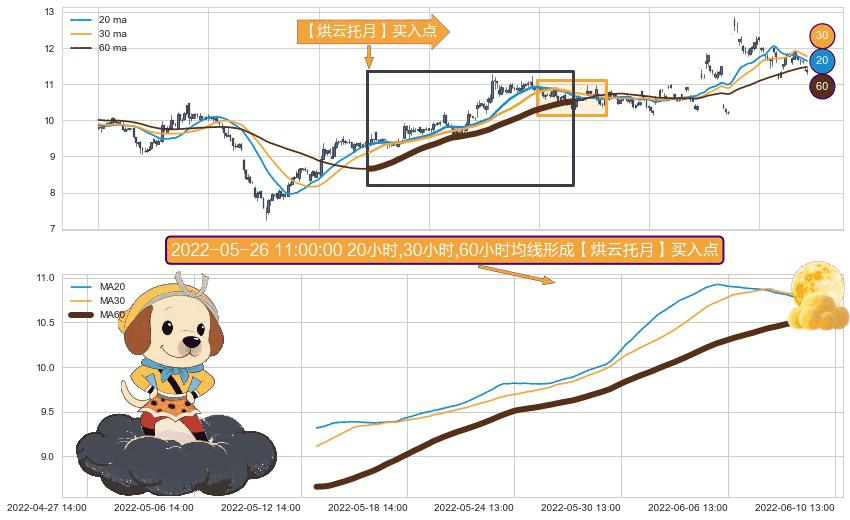 ⚀ 2022-05-13 11:00:00小时-2022-06-09 13:00:00小时显现 20小时-30小时-60小时均线 【烘云托月】买入点 看多信号,后市看涨,买入