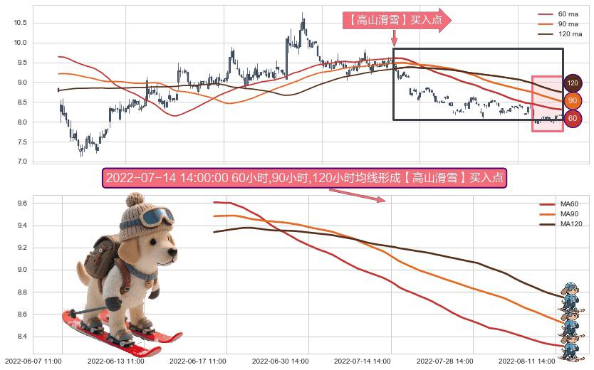 形态多维评估: ⚀ 2022-06-16 14:00:00小时-2022-08-12 14:00:00小时显现 60小时-90小时-120小时均线 【高山滑雪】买入点 看多信号,后市看涨,买入