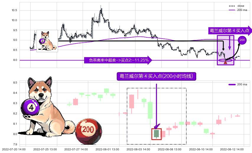 形态多维评估: ⚀ 2022-08-04 13:00:00-小时显现 葛兰威尔均线 200小时均线 第④买入点 下降趋势均值回复的短线反弹信号,后市看涨,买进信号