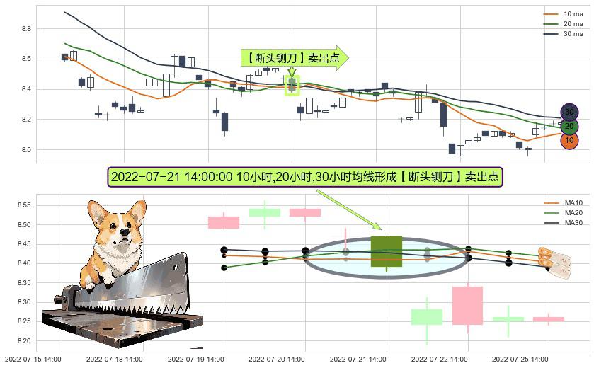 形态多维评估: ⚀ 2022-07-21 14:00:00小时显现 10小时-20小时-30小时均线 【断头铡刀】卖出点 看空信号,后市看跌,卖出