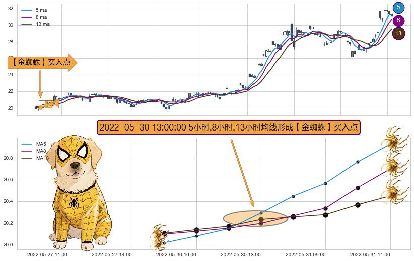 ⚀ 2022-05-30 13:00:00小时显现 5小时-8小时-13小时均线 【金蜘蛛】买入点 看多信号,后市看涨,买入