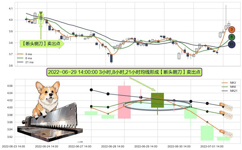 ⚀ 2022-06-29 14:00:00小时显现 3小时-8小时-21小时均线 【断头铡刀】卖出点 看空信号,后市看跌,卖出