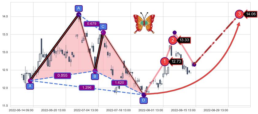 ➣ 已完成【蝴蝶】形态起点X: 06-13:13, 终点D: 07-22:13, 共71交易小时