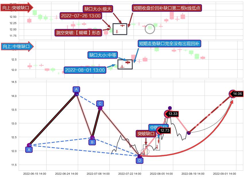 ➣ 突破缺口形成后,后续k已经超过14根,跳空突破【蝴蝶】形态关键点后, 出现【中度回踩】迹象,短期收盘价回补缺口第二根k线低点