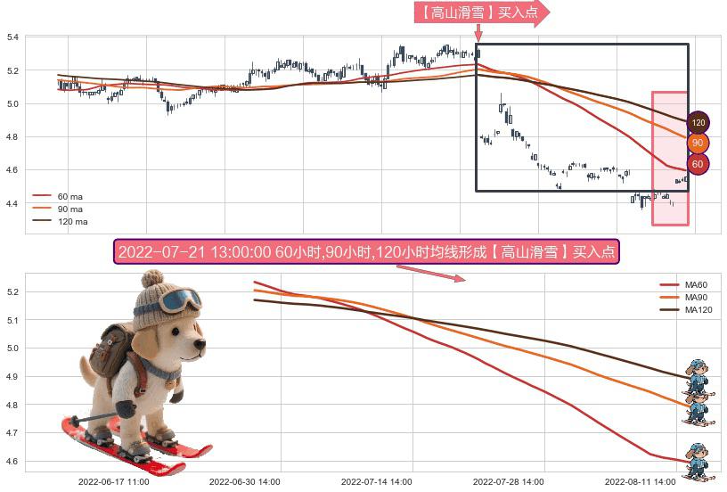⚀ 2022-06-28 14:00:00小时-2022-08-12 14:00:00小时显现 60小时-90小时-120小时均线 【高山滑雪】买入点 看多信号,后市看涨,买入