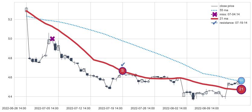 ⚅ 均线向上突破后,2022-06-21 14:00:00-小时价格上探超过 正乖离率超卖第三卖点 :3.1969887732770474后开始止涨下跌再次均线破位