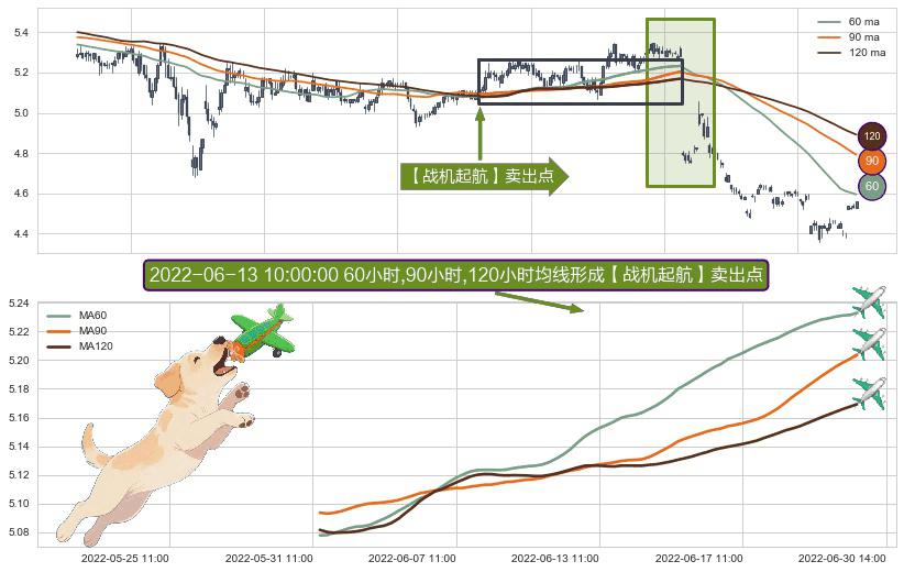 ⚀ 2022-05-31 13:00:00小时-2022-06-28 14:00:00小时显现 60小时-90小时-120小时均线 【战机起航】卖出点 看空信号,后市看跌,卖出