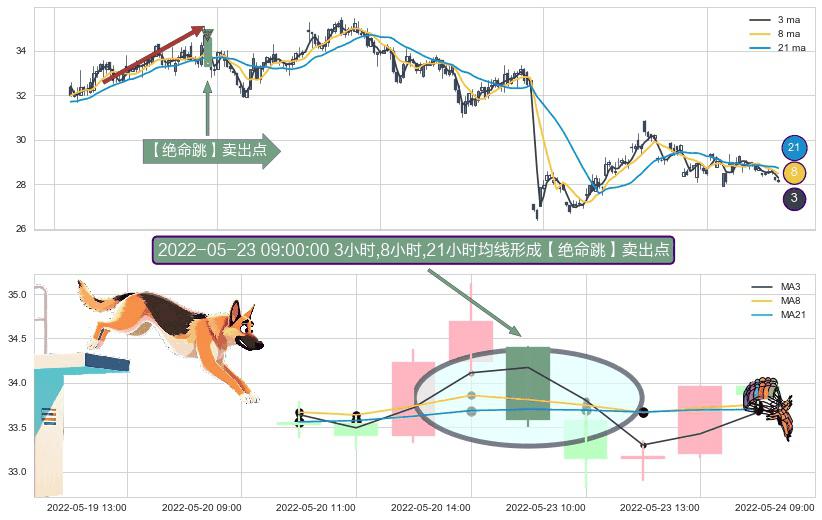 形态多维评估: ⚀ 2022-05-23 09:00:00小时显现 3小时-8小时-21小时均线 【绝命跳】卖出点 看空信号,后市看跌,卖出