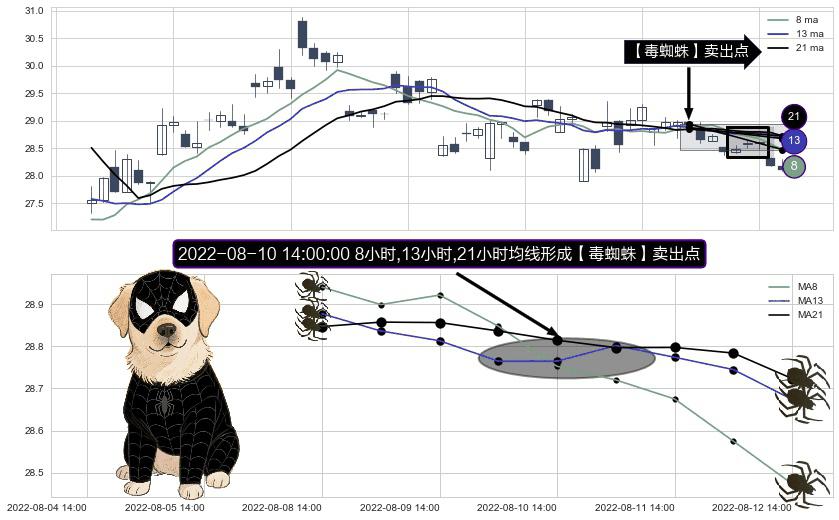 形态多维评估: ⚀ 2022-08-10 14:00:00小时显现 8小时-13小时-21小时均线 【毒蜘蛛】卖出点 看空信号,后市看跌,卖出