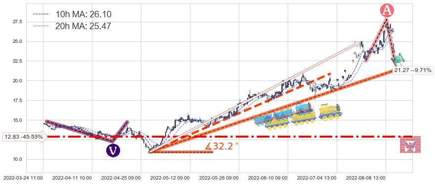 从2022-04-26 14:00至2022-08-12 13:00,共包含250个小时,阶段股价上涨83.97%,阶段股价变动位移路程比: 1 : 4,上涨趋势角度: 32.2
