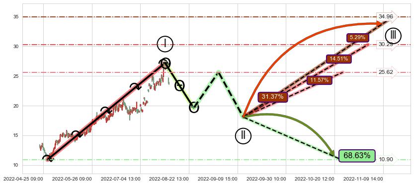 ➢ 循环浪继续向上【最高】位置(11-14:13, 34.96),匹配聚类样本比例16.86%, 可能性概率5.29%