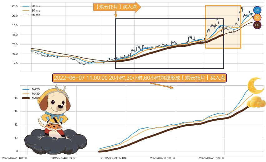 形态多维评估: ⚀ 2022-05-13 13:00:00小时-2022-07-13 14:00:00小时显现 20小时-30小时-60小时均线 【烘云托月】买入点 看多信号,后市看涨,买入