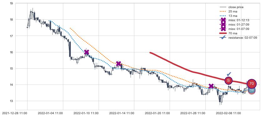 下跌趋势03-03 11:00-05-10 13:00,均线70确认关键阻力2处