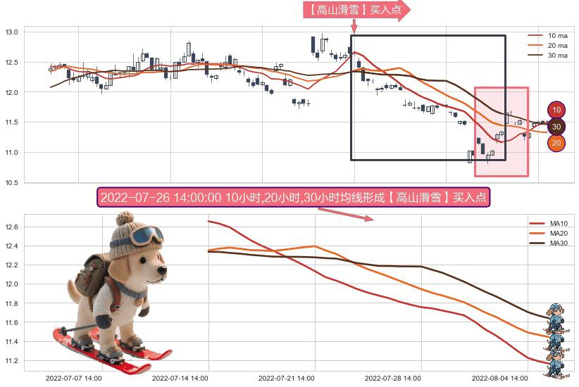 ⚀ 2022-07-14 14:00:00小时-2022-08-05 14:00:00小时显现 10小时-20小时-30小时均线 【高山滑雪】买入点 看多信号,后市看涨,买入