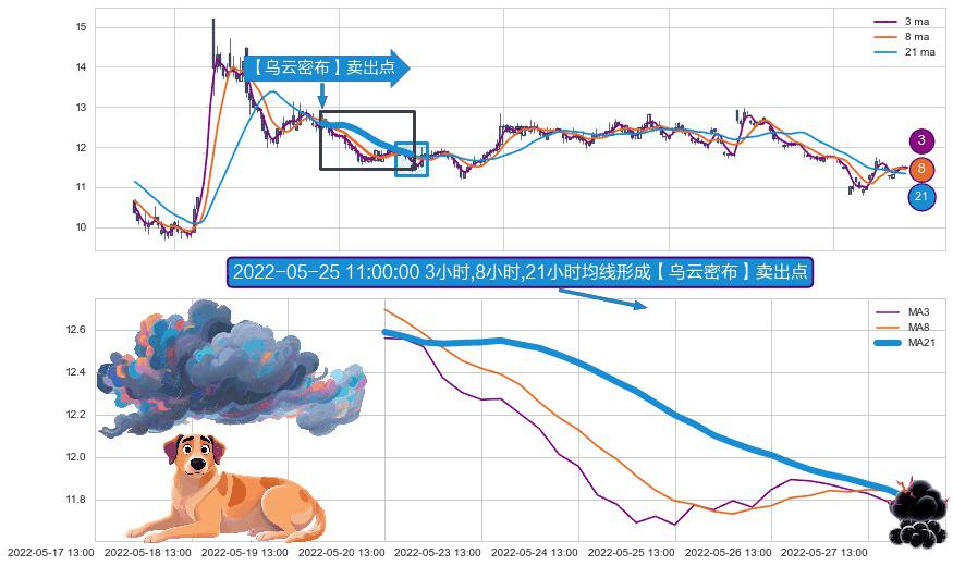 ⚀ 2022-05-20 13:00:00小时-2022-05-30 09:00:00小时显现 3小时-8小时-21小时均线 【乌云密布】卖出点 看空信号,后市看跌,卖出