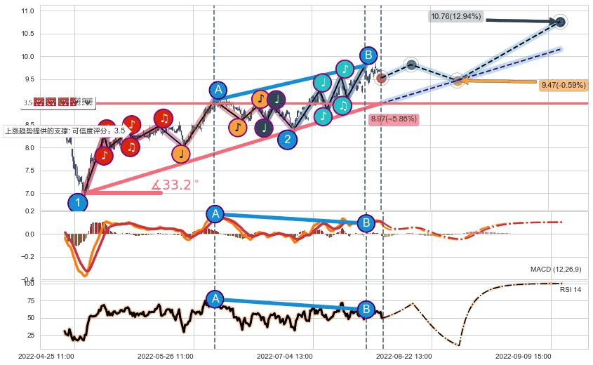 ♘ 支撑价格位8.85,可信任强度90.73%,距离最后交易2022-08-12 14:00形成的收盘价格9.53相差 -7.11%