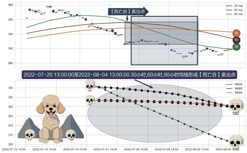 形态多维评估: ⚀ 2022-07-20 14:00:00-小时至2022-08-04 13:00:00-小时显现 30小时-60小时-90小时均线 【死亡谷】卖出点 看空信号,后市看跌,卖出