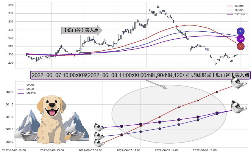 形态多维评估: ⚀ 2022-06-07 11:00:00-小时至2022-06-08 11:00:00-小时显现 60小时-90小时-120小时均线 【银山谷】买入点 看多信号,后市看涨,买入