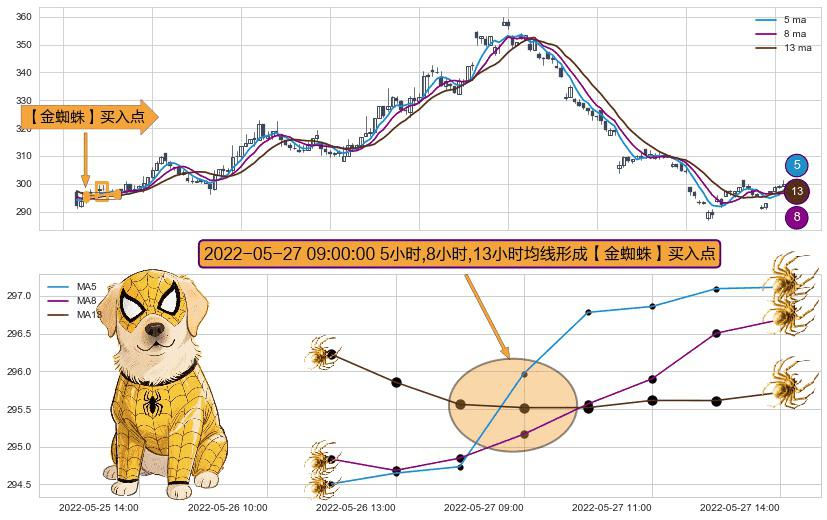 形态多维评估: ⚀ 2022-05-27 09:00:00小时显现 5小时-8小时-13小时均线 【金蜘蛛】买入点 看多信号,后市看涨,买入