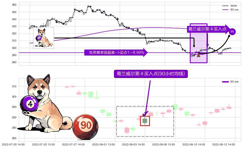 形态多维评估: ⚀ 2022-08-03 14:00:00-小时显现 葛兰威尔均线 90小时均线 第④买入点 下降趋势均值回复的短线反弹信号,后市看涨,买进信号